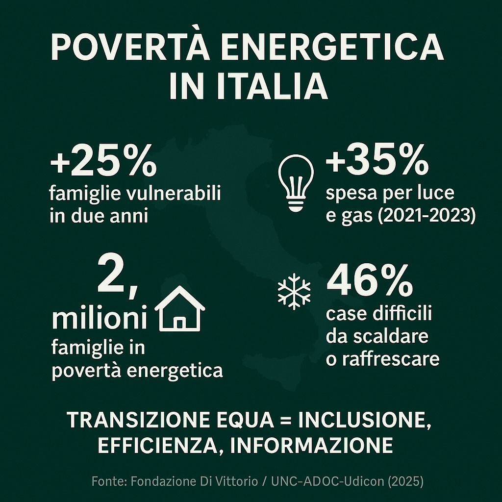 Un’indagine della Fondazione Giuseppe Di Vittorio per le principali associazioni dei consumatori rivela un aumento del 25% della povertà energetica in Italia negli ultimi due anni. Criticità strutturali, inefficienza edilizia e scarsa informazione impediscono a oltre 2,2 milioni di famiglie di accedere a energia adeguata e sostenibile